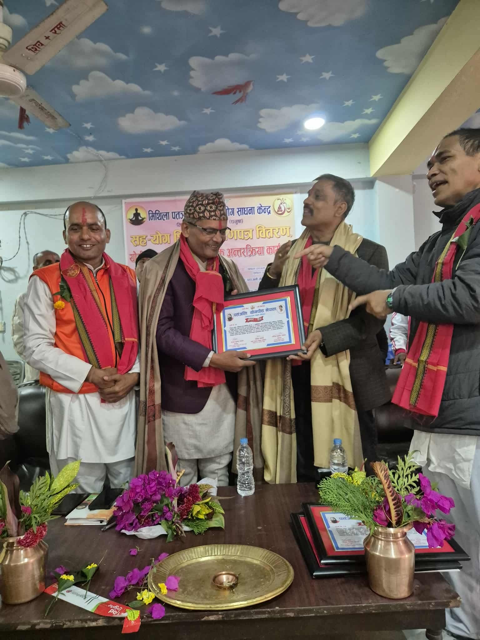 मंगलबार मिथिला पतञ्जली आरोग्य योग साधना केन्द्रका अध्यक्ष संजय यादवको अध्यक्षतामा तथा नगर प्रमुख महेन्द्र महतोको प्रमुख अतिथ्यतामा र उपप्रमुख सुनिता सिंह बुढाथोकीको विशिष्ट अतिथ्यतामा सम्पन्न कार्यक्रममा योग क्षेत्रमा योगदान पुर्‍याउने विशिष्ट योगीहरूलाई सम्मान गरियो।