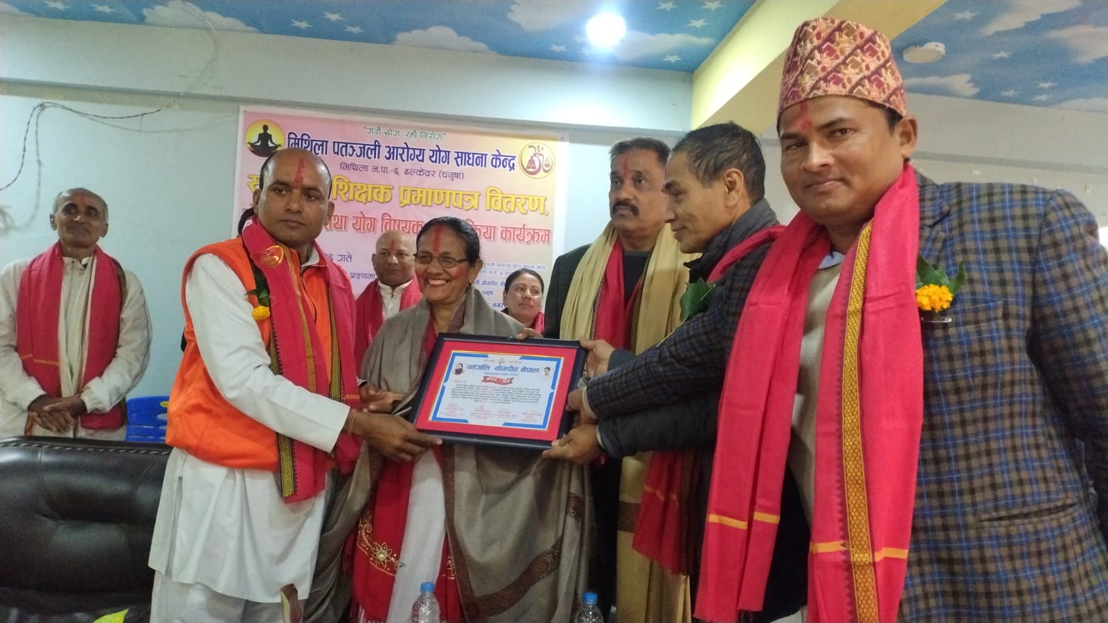 मिथिला पतञ्जली आरोग्य योग साधना केन्द्रको आयोजनामा सह-योग शिक्षक प्रमाणपत्र वितरण र योगी सम्मान कार्यक्रम सम्पन्न
